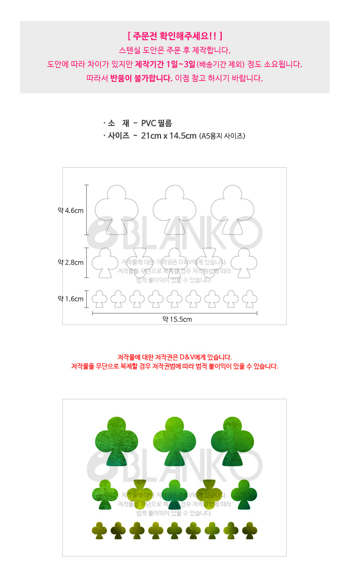 | 품명 및 모델명 | [스텐실_908] 클로버 템플릿(A5) | 소재 | PVC 필름 |